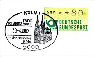 Paus Paulus II bezocht het aartsbisdom Keulen op 30 april 1987. In het bijzondere poststempel is een afbeelding van de Dom van Keulen opgenomen. Op 1 mei 1987 verklaarde de Paus zuster Edith Stein zalig. Zij was een rooms-katholieke Joods-Duitse filosofe en feministe, geboren te Breslau op 12 oktober 1891. Op 15 april 1934 trad zij in bij de orde van de ongeschoeide karmelietessen in Keulen. Daar nam ze de kloosternaam Teresa Benedicta van het Kruis aan. In verband met de opkomst van de nazi’s en om vervolging te voorkomen ging zij in 1938 naar het Karmelietessenklooster in het Nederlands Limburgse Echt. Twee jaar later werd zij, met haar zus Rosa die ook was ingetreden, opgepakt door de Gestapo en via Westerbork naar Auschwitz gedeporteerd. Op 9 augustus 1942 werd zij samen met haar zus in de gaskamer ‘Das Kleine Weisse Haus’ in Auschwitz-Birkenau I in Polen omgebracht. Op 11 oktober 1998 werd zij door de Paus heilig verklaard.