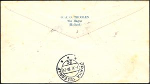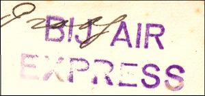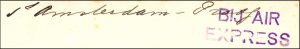 Opvallend was echter de taalfout die was gemaakt in de stempelafdruk ‘BIJ AIR EXPRESS’. Men zou verwachten ‘BY AIR’, dus dat maakte mij toch wel een beetje achterdochtig. Was de afdruk van dit stempeltje aangebracht door de afzender van het poststukje? Waarschijnlijk wel. Want ik heb een deze fout opgenomen in het stempel gezien als afdruk in blauwe inkt op eenzelfde enveloppen verzonden door de heer Tholen naar Karlsruhe en Baden Baden, ook op 1 mei 1930 vanuit Amsterdam.