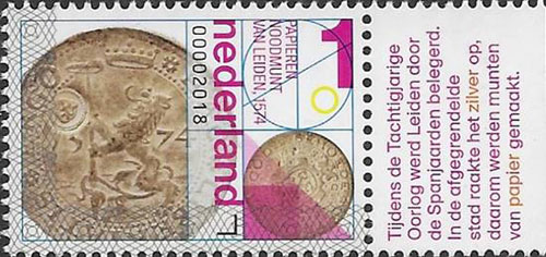 De zegel van 35 cent laat ons het ‘noodgeld’ zien. Door de belegering raakte het geld op, en liet het stadsbestuur munten van papier maken. In 2018 gaf de PostNL een zegel uit van dit noodgeld.