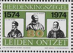 De ‘helden’ van het beleg van Leiden worden herdacht op de zegel van 80 cent. Van links naar rechts staan afgebeeld: Jan van der Does, de bevelhebber van de schutterij; Pieter van der Werff, de Leidse burgemeester tijdens het beleg en Jan van Hout, de stadssecretaris.