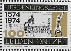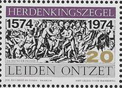 De zegel van 20 cent beeldt de hongersnood van 1574 uit. Door de Spaanse belegering was Leiden afgesloten van de buitenwereld en kon er niets de stad in worden gebracht. 6000 van de 18000 Leidenaars zijn tijdens de belegering omgekomen van de honger en de pest die was uitgebroken.