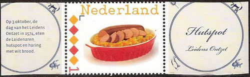 Op de laatste zegel van 100 cent wordt de verdeling van haring, wittebrood en hutspot herdacht. Rechts op de zegel staat Cornelis Joppenszn, met de hutspot pan tussen zijn benen.