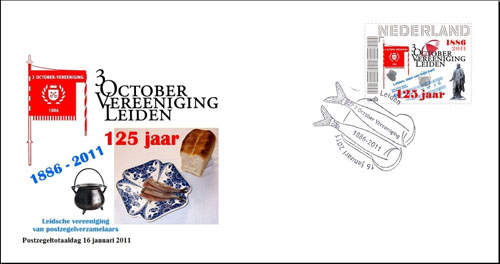 In 2011 bestond de 3 October Vereeniging 125 jaar en werd er een fdc met een persoonlijke postzegel over uitgegeven. Natuurlijk mocht ook hierop de haring, wittebrood en de hutspot pan niet ontbreken. Bijzonder is ook het stempel met haring op wittebrood.