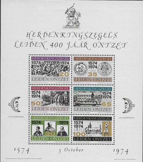 In 1974 was het 400 jaar geleden dat Leiden ontzet was. De 3 October Vereeniging nam toen het initiatief om een siervel met herdenkingszegels uit te geven. De zegels werden gedrukt bij Joh. Enschede in Haarlem. Bovenaan het vel staat het stadswapen van Leiden, met de Leidse sleutels en het motto: Haec Libertatis Ergo (dit omwille van de vrijheid). Aan de zijkanten staan de zogenaamde Geuzenpenningen. Deze werden door de Watergeuzen om hun hals gedragen. In de penning staat de ’strijdkreet’ van de Watergeuzen: ‘Liever Turks dan Paaps’.