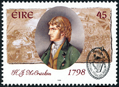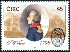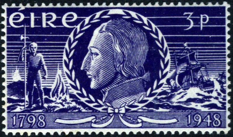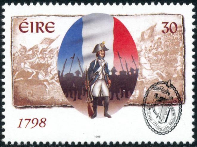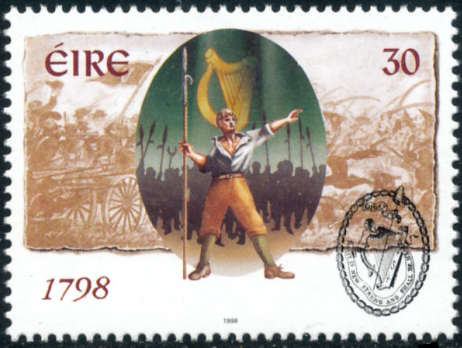 Sinds oktober 1691 werd Ierland geregeerd door de anglicaans-protestantse elite die bestond uit leden van de ‘Church of England’ en nauw verbonden was met de Britse kroon. Daardoor werd de katholieke bevolking en ook de niet-anglicaanse protestanten bewust gediscrimineerd. Dat leidde tot protesten en tien jaar later werd de ‘Society of United Irishmen’ opgericht met als doel meer zelfbeschikking te verkrijgen door hervormingen. Met tegenzin werd door het parlement gedeeltelijk ingestemd en daarop werd de roep om de band met Engeland te verbreken steeds luider. Toch bleef de katholieke bevolking achtergesteld. Dat leidde tot gewapend verzet. Op de bovenstaande postzegel een verzetsstrijder in 1798 met rechtsonder het symbool van de United Irishmen.