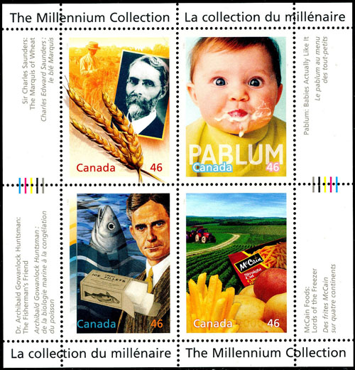 Voedingsmiddelen en gerechten komen volop voor als afbeelding op postzegels en postwaardestukken. Een opvallend voorbeeld vond ik in de serie van 17 blokjes met vier postzegels die de Canadese Post eind 1999 en begin 2000 uitgaf bij de eeuwwisseling. Meer reclameplaatjes op het blokje uitgegeven op 17 maart 2000 dan postzegels naar mijn mening. Vooral door het noemen van merken en producenten. De uitgifte van de lange serie blokjes met totaal 68 postzegels was voor mij aanleiding met het verzamelen van Canadese postzegels te stoppen. Op de postzegel rechtsonder zijn aardappelen verwerkt tot patat (French fries) door ‘McCain Foods’. De Britten noemen het ‘chips’ en de Vlamingen ‘friet’. Net als de Nederlanders, maar ook het woord ‘patat’ wordt hier veel gebruikt. De Duitstaligen zeggen ‘Pommes’ of ‘Fritten’ en de Franstaligen ‘frites’. België is bekend vanwege de vele ‘frietkotten’ die men overal kan tegenkomen, terwijl de Britten veel afhaalgelegen-heden (take away) kent waar men ‘fish and chips’ kan kopen. Vroeger gewikkeld in een krant maar tegenwoordig in een nette papieren zak.