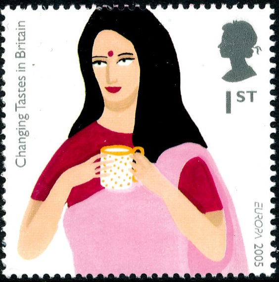 In haar omgeving bevonden zich nogal wat zogenoemde ‘tandoori’ restaurants. Afkomstig uit India serveren deze restaurants vele Indiase gerechten die bereid worden met specerijen en door deze te marineren. Het was wat moeilijk om een specifiek gerecht op de Europapostzegel te verbeelden en daarom beperkte Catell zich tot het afbeelden van een vrouw uit India met een stip, een ‘tikka’ of ‘bindi’ op het voorhoofd en een kop thee in de hand. Thee is oorspronkelijk afkomstig uit China maar wordt ook veel in India geteeld. Heel bekend is de ‘darjeeling’ thee uit de Indiase staat West-Bengalen.