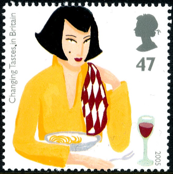 Catell Ronca vond in South Kensington een aantal Italiaanse restaurants. Als Zwitserse wist ze pasta’s te waarderen en dat werd dan ook de tweede afbeelding voor een postzegel in deze serie. Haar eerste schetsen waren gebaseerd op de etenswaren die zij overal tegenkwam, zoals bovenaanzichten van pizza’s en taartjes die ‘pies’ worden genoemd. Maar de gerechten in de handen van etende mensen vond zij meer toepasselijk en duidelijker om de ontwikkeling van de smaak te illustreren. Op de postzegel van 47 pence nam Catell een vrouw op die pasta of spaghetti eet in een Italiaans restaurant. Met een glas rode wijn.