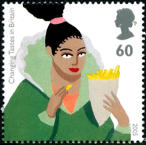 Royal Mail, de Britse postdienst, gaf op 23 augustus 2005 een serie van zes postzegels uit ontworpen door de in Basel, Zwitserland, geboren Catell Ronca en vormgegeven door Rose Design. De zegels werden gedrukt door Joh. Enschedé Security Printing BV in Haarlem. Catell Ronca kreeg de opdracht om eetgewoonten te verbeelden door de multiculturele samenleving in Groot Brittannië. Zij was toen nog student aan het ‘Royal College of Art’ in de Londense wijk South Kensington. In deze wijk is een aantal musea te vinden, zoals het ‘Victoria & Albert Museum’, het ‘Natural History Museum’ en het ‘Science Museum’. Maar ook vele restaurants, eenvoudig, maar ook chique uit geheel Europa en Azië. De bevolking van deze wijk bestaat voornamelijk uit Engelsen, zo’n 85%. Verder Aziaten bijna 5%, ook 5% mensen met dubbelbloed, mensen met een Afrikaanse achtergrond 3% en mensen uit andere werelddelen 2%. Catell bezocht regelmatig de markten en restaurants in South Kensington en omgeving en deed op die wijze inspiratie op voor het ontwerpen van de serie postzegels. Uiteraard kwam ze zo ook in contact met ‘fish and chips’ dat ze, alleen met de zak ‘chips’, verbeelde op de postzegel van 60 pence. Wat wij in Nederland een zak ‘chips’ noemen heet in Groot-Brittannië ‘crisps’.