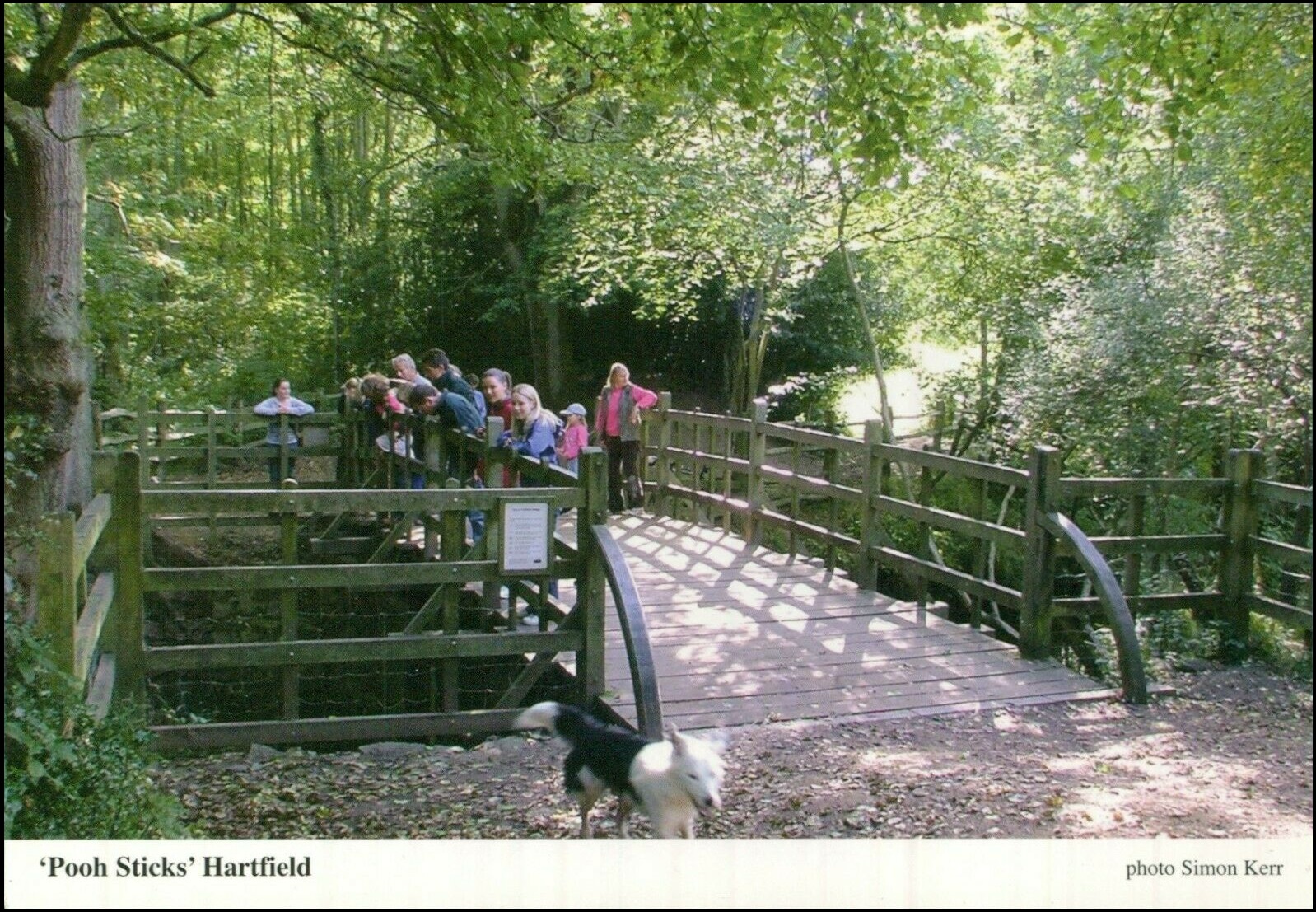 Hier vond Winnie the Pooh met zijn vrienden, aldus de schrijver van het boek Alan Alexander Milne, een spelletje uit door aan de ene kant van de brug stokjes in het water te gooien en aan de andere zijde tevoorschijn zien komen. Het stokje dat het eerst verscheen was dan van de winnaar van het spelletje. Duizenden toeristen spelen dit spelletje na, vooral kinderen, zoals te zien is op de prentkaart. In Hartfield kan een huis worden bezocht met de naam ‘Pooh Corner’ aan de High Street, met daarin een klein museum en een winkeltje waar men allerhande artikelen kan kopen van Winnie the Pooh en zijn vrienden. Maar waar men natuurlijk ook een kop thee kan drinken en een kleinigheid kan eten, binnen of buiten onder een parasol. Vandaar ook mes en vork en peper en zoutstel in het stempel.