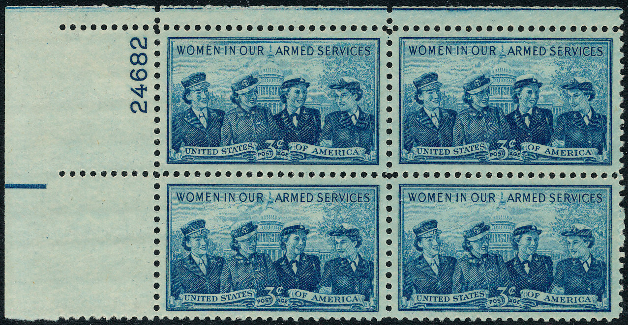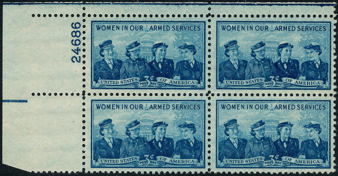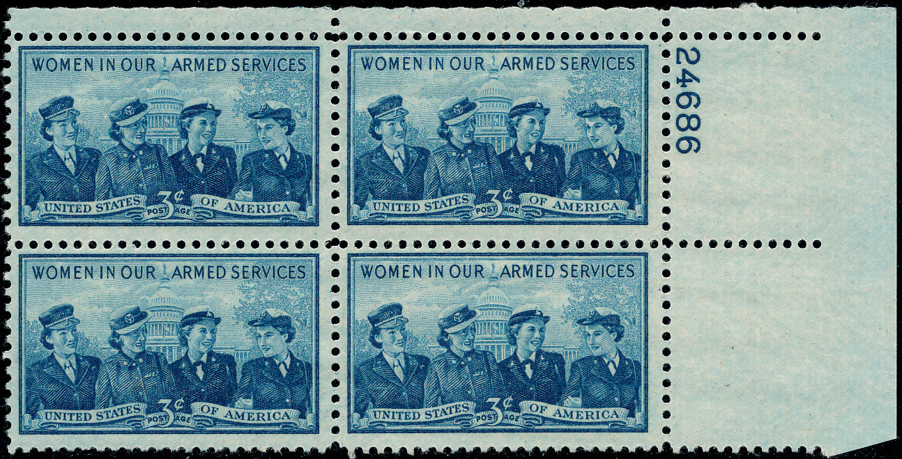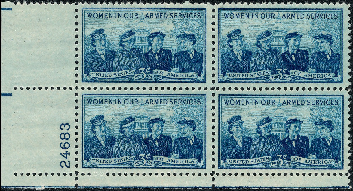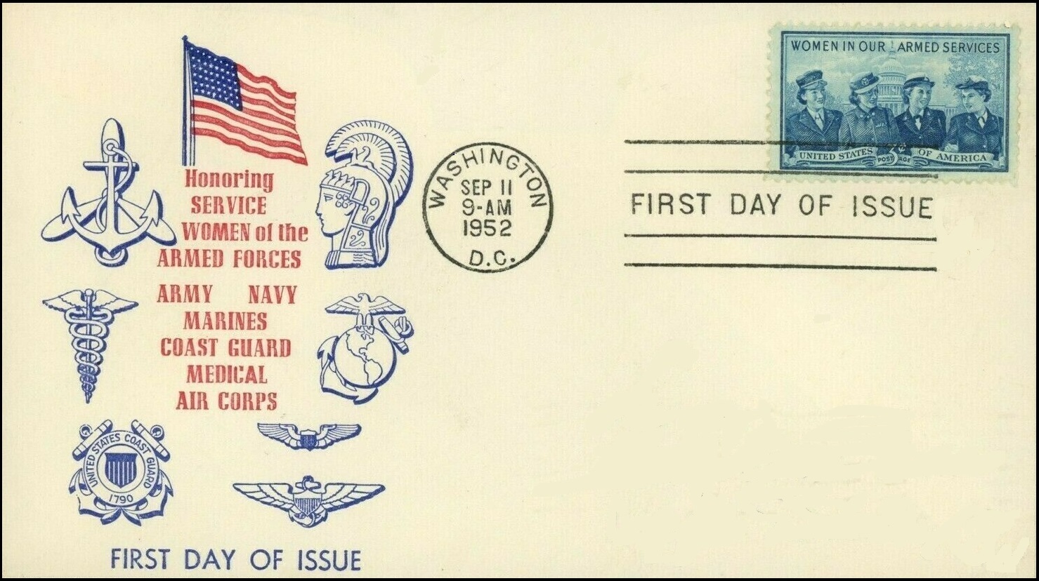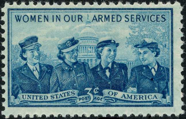Ten behoeve van de verbetering van verbindingen gedurende de Eerste Wereldoorlog tussen legeronderdelen en hoofdkwartieren via radio, telegraaf en telefoon werd in 1917 het ‘Army Signal Corps’ opgericht. Ook dit onderdeel van het leger bestond uit louter vrouwen. Een van de belangrijkste taken was de bediening van de telefooncentrales tussen de veldtelefoons van de commandoposten en het hoofdkwartier. Ze werden ‘Hello Girls’ genoemd. Pas vanaf 1918 kregen de vrouwelijke militairen eigen uniformen. Militaire rangen werden ook ingevoerd vanaf tweede luitenant tot majoor, afhankelijk van de belangrijkheid van de post die werd bekleed. In 1942, gedurende de Tweede Wereldoorlog, werden meer vrouwencorpsen opgericht zoals de ‘Marine Corps Women’s Reserve’ en het ‘Women’s Army Corps’, de WAC. In 1943 werd dit uitgebreid met de ‘Army Air Forces’, de ‘Air WACs’ of WAFS. De vier vrouwencorpsen werden door hun vertegenwoordigers afgebeeld op de postzegel van 11 september 1952 met op de achtergrond het Capitool in Washington D.C. waarvan de eerste steen werd gelegd op 18 september 1793. Ontwerper van de postzegel was William K. Schrage. Hij koos daarvoor bestaande foto’s die echter waren vervaardigd met behulp van fotomodellen die hadden geposeerd ten behoeve van een wervingsfolder. De afgebeelde vrouwen waren nooit in militaire dienst geweest.
