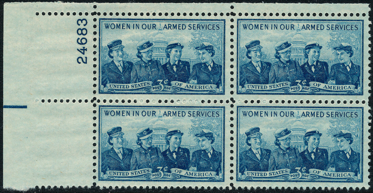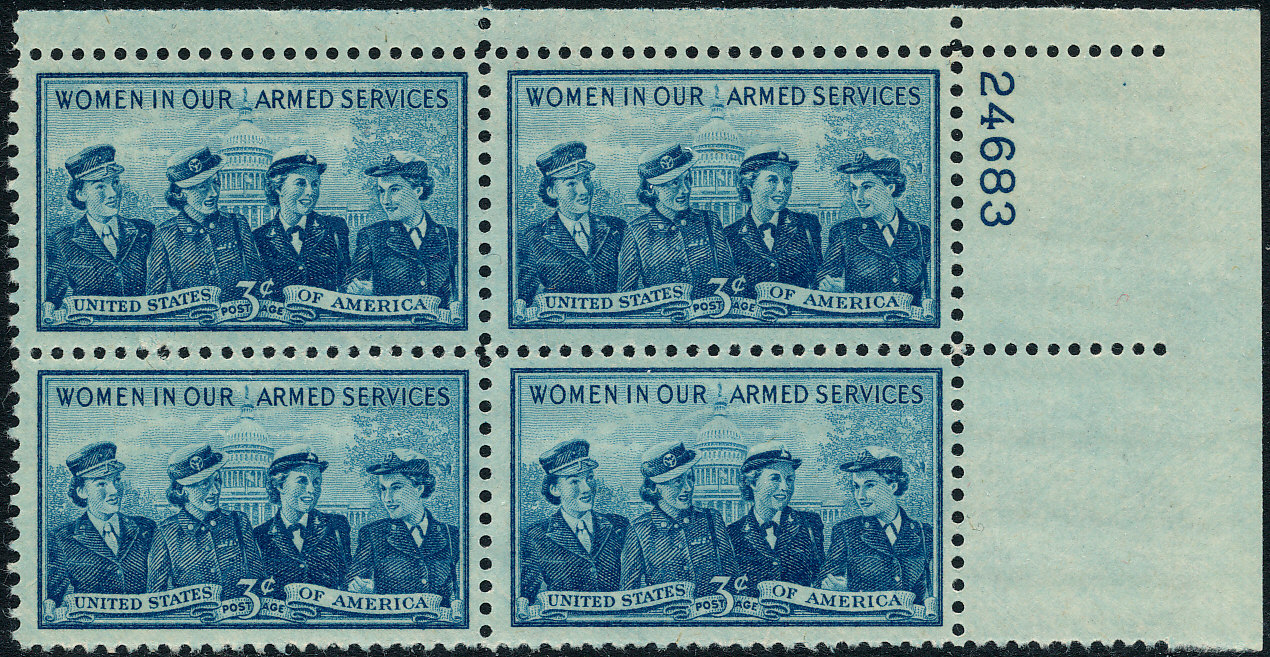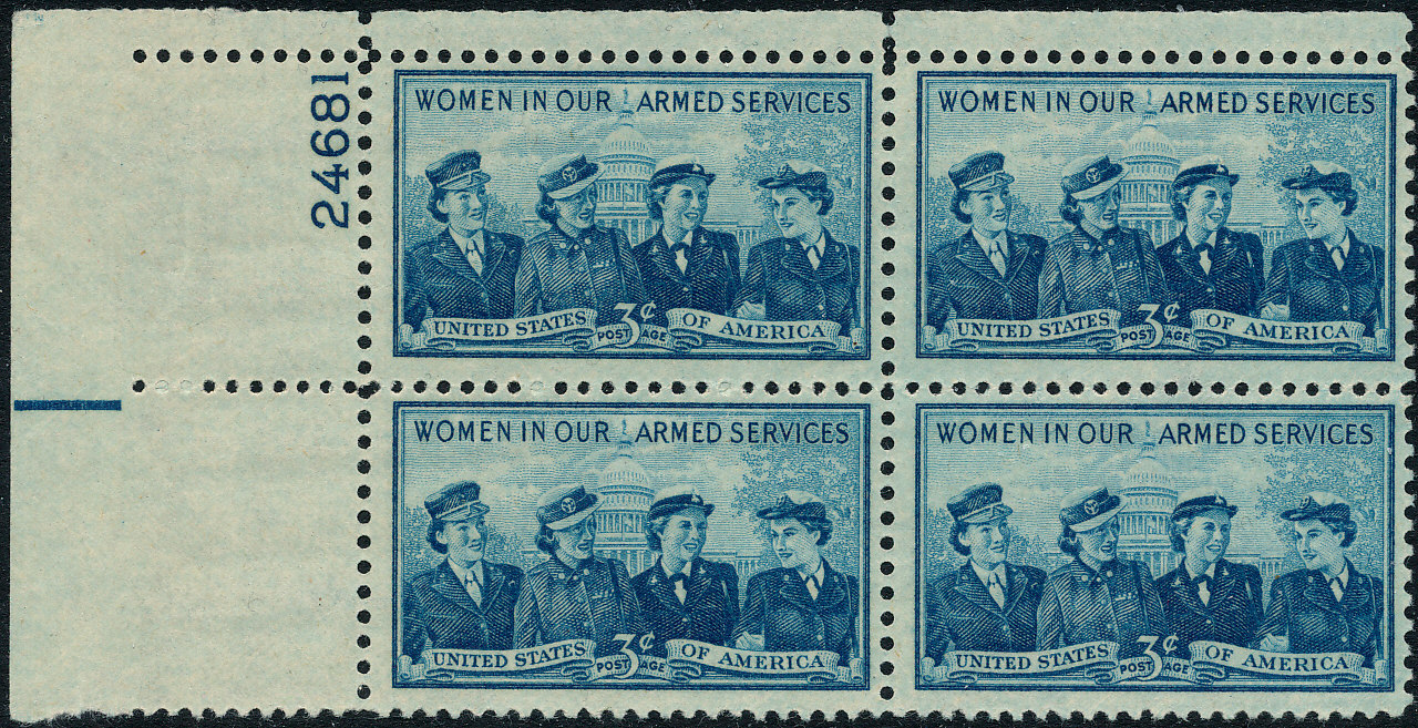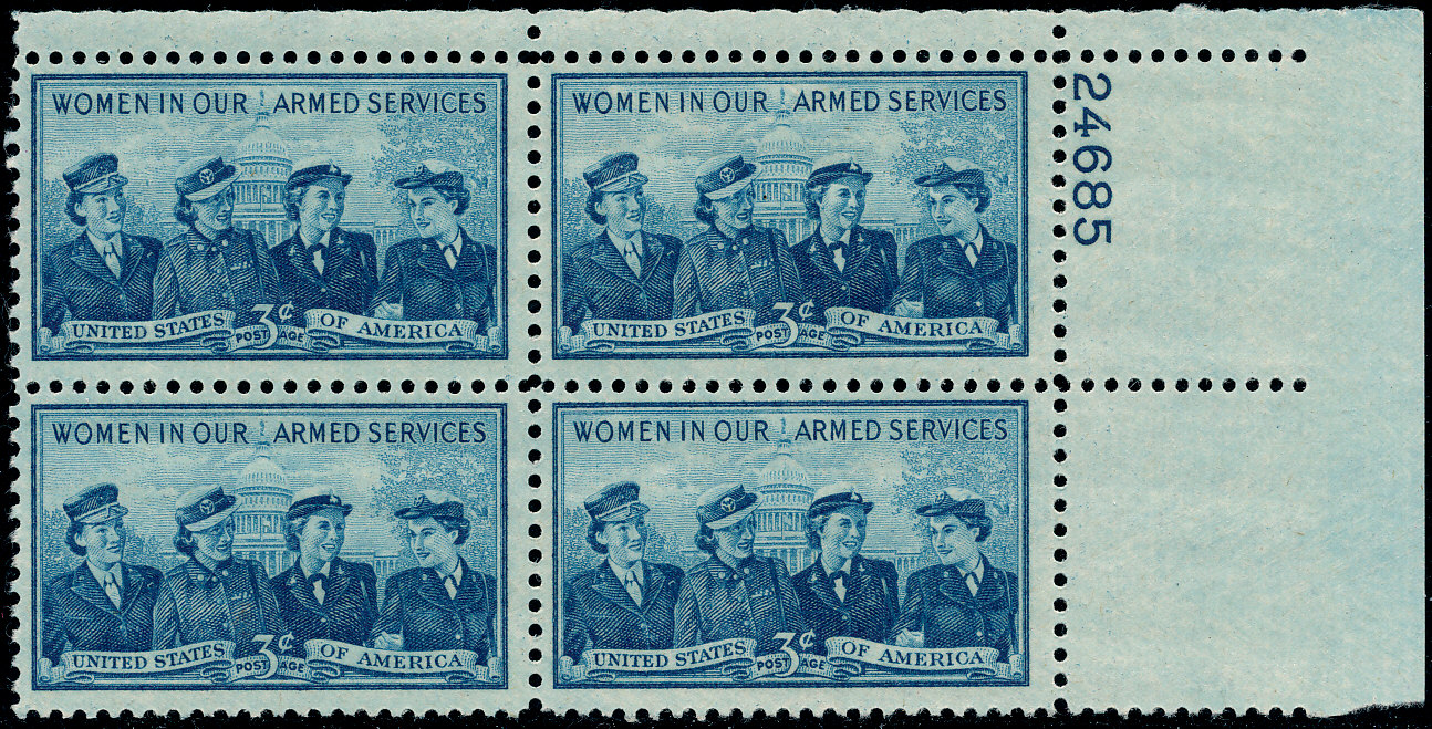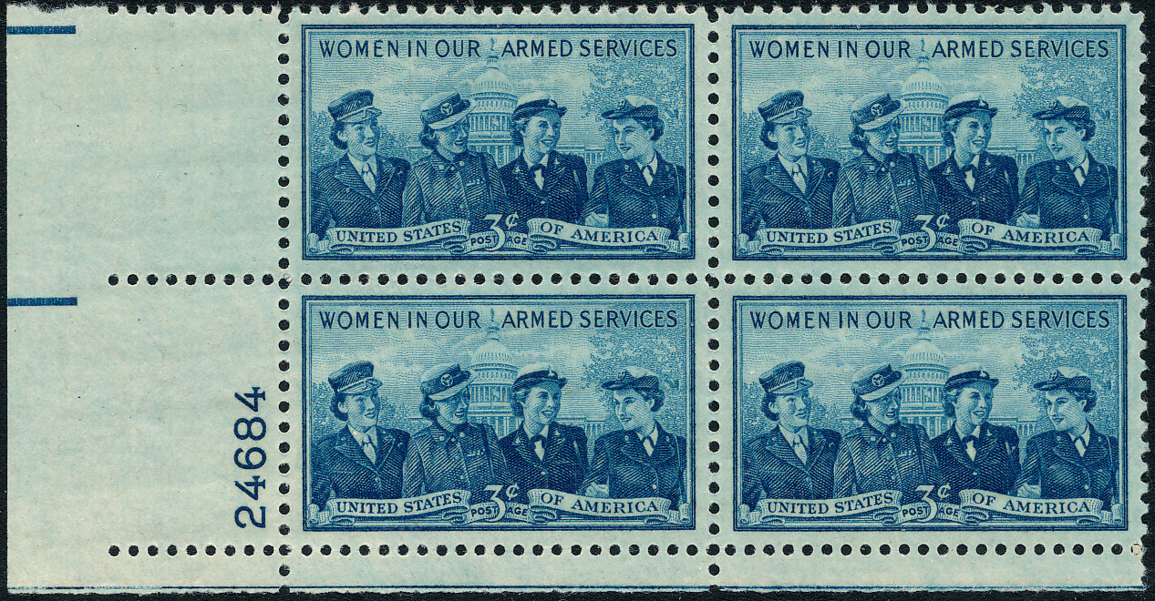 Ten behoeve van de verbetering van verbindingen gedurende de Eerste Wereldoorlog tussen legeronderdelen en hoofdkwartieren via radio, telegraaf en telefoon werd in 1917 het ‘Army Signal Corps’ opgericht. Ook dit onderdeel van het leger bestond uit louter vrouwen. Een van de belangrijkste taken was de bediening van de telefooncentrales tussen de veldtelefoons van de commandoposten en het hoofdkwartier. Ze werden ‘Hello Girls’ genoemd. Pas vanaf 1918 kregen de vrouwelijke militairen eigen uniformen. Militaire rangen werden ook ingevoerd vanaf tweede luitenant tot majoor, afhankelijk van de belangrijkheid van de post die werd bekleed. In 1942, gedurende de Tweede Wereldoorlog, werden meer vrouwencorpsen opgericht zoals de ‘Marine Corps Women’s Reserve’ en het ‘Women’s Army Corps’, de WAC. In 1943 werd dit uitgebreid met de ‘Army Air Forces’, de ‘Air WACs’ of WAFS. De vier vrouwencorpsen werden door hun vertegenwoordigers afgebeeld op de postzegel van 11 september 1952 met op de achtergrond het Capitool in Washington D.C. waarvan de eerste steen werd gelegd op 18 september 1793. Ontwerper van de postzegel was William K. Schrage. Hij koos daarvoor bestaande foto’s die echter waren vervaardigd met behulp van fotomodellen die hadden geposeerd ten behoeve van een wervingsfolder. De afgebeelde vrouwen waren nooit in militaire dienst geweest.