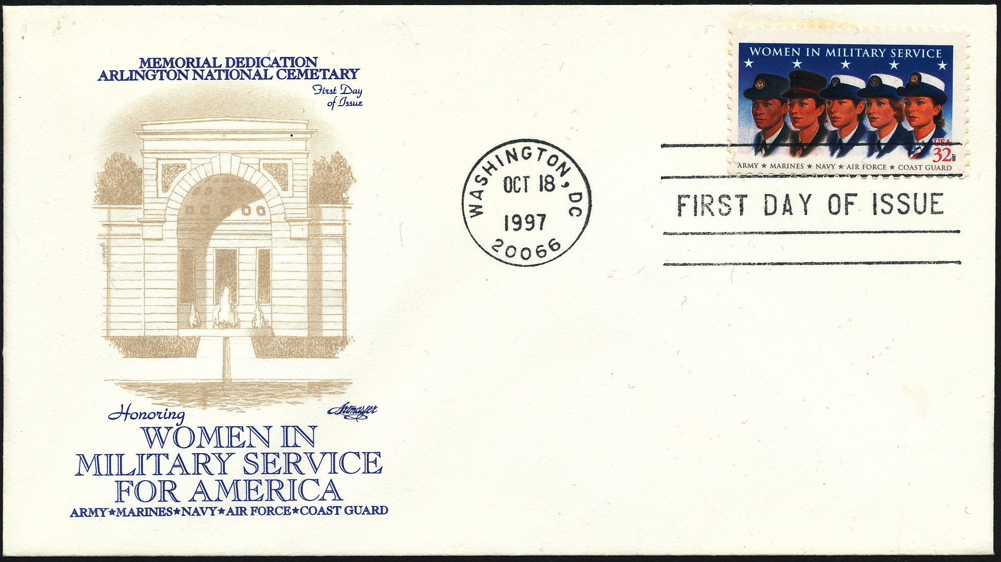 Op het nationale militaire kerkhof van Arlington, Virginia, werd een monument opgericht ter nagedachtenis van de vrouwen die hun leven lieten voor hun land. De inwijding van het monument met de naam ‘Women In Military Service For America Memorial’ vond plaats op dezelfde dag als de uitgiftedatum van de postzegel, 18 oktober 1997. Arlington is een van de 139 nationale begraafplaatsen in de Verenigde Staten en ligt vlak bij het Pentagon. Naast militairen liggen hier bekende Amerikanen begraven, zoals presidenten, politici, astronauten en burgers die zich bijzonder verdienstelijk hebben gemaakt. De begraafplaats werd in 1864 in gebruik genomen en telt nu ongeveer 400.000 graven.
