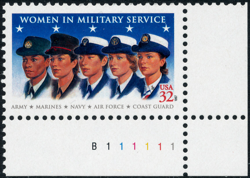 Op 18 oktober 1997 werd door de Amerikaanse postdienst, sinds 1971 met de benaming USPS, de ‘United States Postal Service’, opnieuw een postzegel uitgegeven gewijd aan vrouwen in militaire dienst. Sinds 1901 hebben bijna tweemiljoen vrouwen dienstgenomen en velen zijn nog steeds in dienst van het leger, het korps mariniers, de marine, de luchtmacht en de kustwacht. Het systeem van de doorlopende plaatnummering werd vanaf 1980 geleidelijk vervangen door de platen, of in dit geval cilinders, te nummeren door te beginnen met een letter en daarna voor elke kleur met een cijfer 1. Werd de plaat of cilinder vervangen dan kreeg deze het cijfer 2. Bij de moderne postzegels van de Verenigde Staten worden geen plaat- of cilindernummers meer gebruikt.