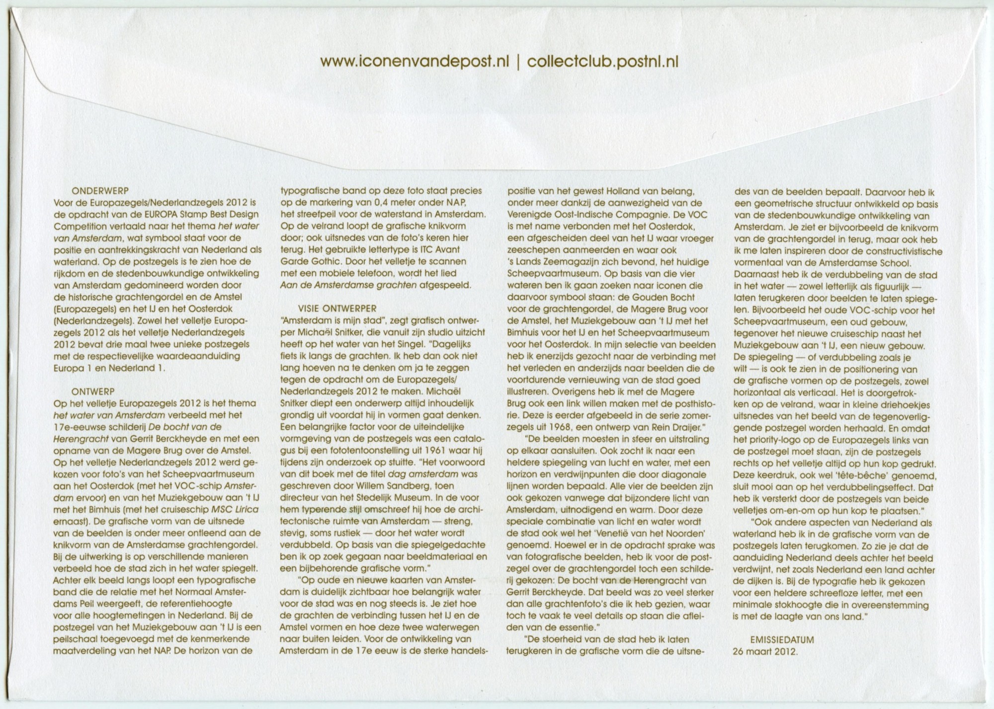 De Europa-postzegels 2012 staan in het gezamenlijke teken van ‘Visit’, waarmee de Europeaan wordt aangespoord andere steden en landen te bezoeken. Grafisch ontwerper Michaël Snitker heeft voor deze Europazegels het water van Amsterdam gekozen (onder de titel Bezoek Amsterdam / Visit Amsterdam), wat symbool staat voor de positie en aantrekkingskracht van Nederland als waterland.