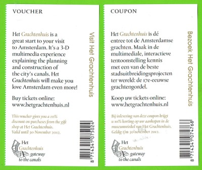 Aan de onderkant van beide vellen bevindt zich een coupon (Nederlandstalig & Engelstalig), die 10 procent korting geeft op aankopen in het museum van Het Grachtenhuis aan de Herengracht 386. Het Grachtenhuismuseum staat op het schilderij van G.A. Berckheyde.