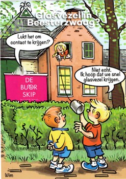Met de tekening op een huis-aan-huis bezorgde vergrote prentbriefkaart, waarop drie kinderen met een touwtjes-telefoon een gesprek voeren, tracht een internetbedrijf een hoog percentage van de bewoners van Beetsterzwaag over te halen zich aan te melden voor de (nu nog) gratis aansluiting van de supersnelle internetverbinding via de glasvezel.