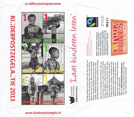 In 2013 heeft een chocolademakersfirma de kinderzegelactie 2013 gesteund door een wikkel van een chocoladereep van een afbeelding van het kinderpostzegelvel ‘Laat kinderen leren’ te voorzien onder het mom ‘Reclame doet verkopen’. Hierbij past de vraag: “Voor wie? Of de chocoladeproducent, of de kinderzegelactie?” De vouwen van de wikkel zijn nog enigszins zichtbaar.