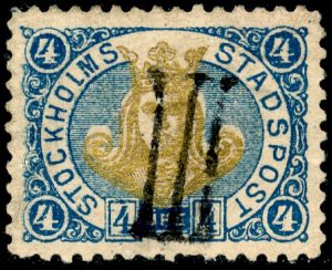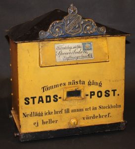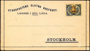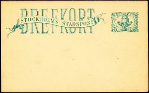 Ook andere stempelvormen kwamen voor zoals twee- of drieregelige stempels met verstelbare datum met en zonder omranding. Ondanks het grote aantal poststukken dat door de stadspostdienst werd verwerkt, eind 1888 bedroeg het totaal aantal meer dan 824.000 stuks, zijn maar weinig poststukken bewaard gebleven. Het doek viel voor de stadspostdienst in Stockholm toen de Zweedse Postdienst actie ondernam op grond van de toenmalige Zweedse Postwet dat zij het alleenrecht had op postbezorging van brieven. Dit werd door het parlement van Zweden uitgebreid met een monopolie op het bezorgen van gesloten briefkaarten of postbladen en open briefkaarten. Het werd bekendgemaakt in een proclamatie gedateerd 23 december 1888. De ‘Stads Posten Stockholm’ werd in feite met de wetswijziging gedwongen om de dienstverlening met ingang van 1 oktober 1889 te beëindigen. De Zweedse Post kocht de gele brievenbussen van ‘Stads Posten’ en liet deze zwart schilderen. Het bovenste ornament van de brievenbus werd vervangen door een nieuw ornament met een gekroonde posthoorn, het logo van de toenmalige ‘Postverket’. Pas in 1912 werden de officiële Zweedse brievenbussen in gele uitvoering geplaatst. In het Zweedse Postmuseum aan het Lilla Nygatan 6 in Stockholm zijn zowel de in geel uitgevoerde brievenbus als een zwart geschilderd exemplaar te zien. Stadspostzegels van Stockholm, voor mij een leuke nevenverzameling naast de officiële Zweedse postzegels tot en met 1944, mijn geboortejaar. Verzamelt u ook stadspostzegels uit het einde van de 19de en begin 20ste eeuw naast de officiële postzegels?