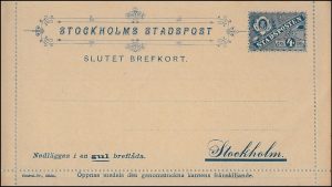 Van de gesloten briefkaart bestaan twee typen. Bij het eerste type staan de letters O van Stadspostens en letter L van Lägges onder elkaar en bij type II de letter P en L onder elkaar. Verder is de perforatie verschillend. De gesloten briefkaarten werden met door de stadspostdienst opgeplakte zegels van 4 öre verkocht. De gesloten briefkaart type I werd voor het eerst verkocht op 24 april 1888. De gesloten briefkaarten werden op een vrij slechte kwaliteit kartonachtig papier gedrukt waardoor soms sterke verkleuringen optraden en de opgeplakte postzegels bruin doorsloegen.