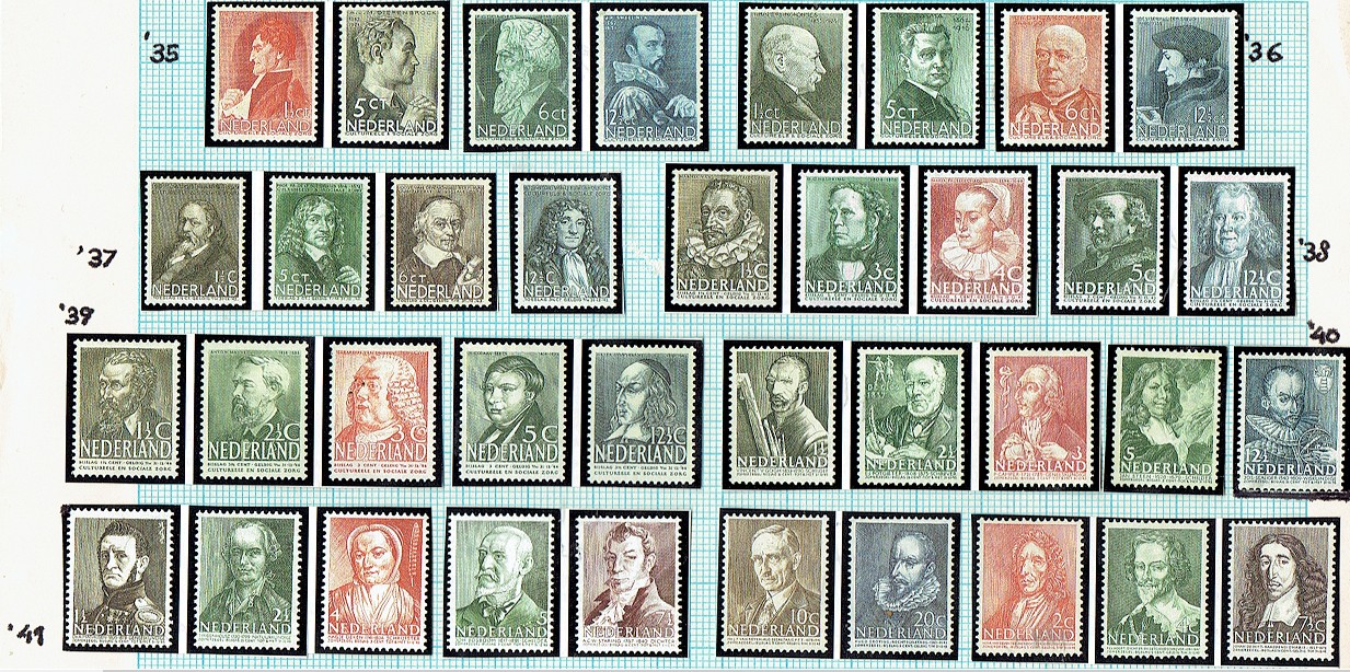 - Opmerkelijk is het feit dat in 1940 de vijf grote Nederlanders ‘beroepsmatig & werkend’ zijn opgevoerd. Een voorwerp of symbool verwijst naar hun activiteit als [1½ ct] schildersdoek & penselen, [2½ ct] schrijfveer & tijdschriftvermelding De Gids, [3 ct] esculaap-teken & doodshoofd, [5 ct] penseel met schildersdoek en [12½ ct] familiewapenschild & metalen ringenstelsel.
