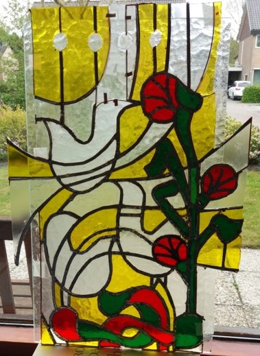 Het bovenste gedeelte van het tiffany glas-in-lood-raam (met daarin rode cirkelvullingen) moet nog afgerond worden, bovendien moet het glas rondom nog in loden strips gevat worden.