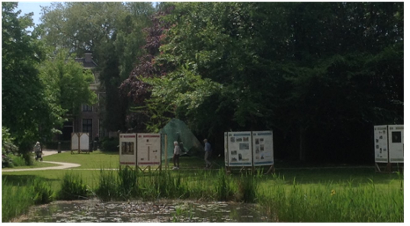 Rondom de vijver in de overtuin van het Lycklamahûs (zichtbaar boven het witte prieel links) aan de Hoofdstraat 80 is de tentoonstelling opgesteld.