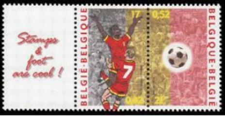 Op de eerste postzegel staat een tekening van een donker gekleurde voetballer, die net een doelpunt heeft gemaakt. Een medespeler tilt de ‘schutter’ uit enthousiaste blijdschap, achting en dankbaarheid op. Hij wordt als het ware op een voetstuk geplaatst, zodat iedereen naar hem op kan kijken. Beide voetballers staan als hoofdrolspelers dominerend op de voorgrond vóór de in een wit postzegelkader gevatte foto.