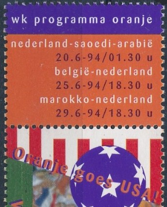 Dit totaalontwerp verwijst naar grootse commerciële WK-circus dat de Amerikanen actief zullen beleven. De schuin geplaatste tekst ‘Oranje goes USA” op de groot formaat postzegel met informatieve tekst op de tab verbeeldt actief-dynamische wijze de omvang en uitbundigheid van de oranje-euforie.