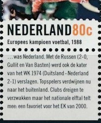 In de emissie ‘Hoogtepunten 20e eeuw’ hebben de ontwerpers Hans Bockting en Will de l’Ecluse o.a. het oog laten vallen op Europees Kampioen Voetbal 1988. De juichende voetballers Marco van Basten en Ruud Gullit met een deel van de Nederlandse vlag op de achtergrond vertegenwoordigen alle Nederlandse spelers van dit voetbaltoernooi.