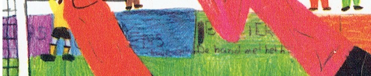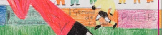 De bal koppende speler op mijn tekening is Peter Schuurmans. Hij was mijn plaatselijke voetbal-idool, de toenmalige topschutter van O.J.C-Rosmalen met loshangend haar en pluizige baard. De langharige persoon op de achtergrond ’protesteert’ vanwege vermeend buitenspel met de winnende goal tegen Wilhelmina.