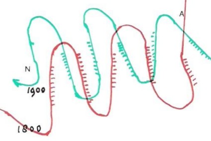 b] Met andere woorden tussen de beeld-doorlopende-postzegels bestaat in werkelijkheid géén logisch verband. In symbolisch zin is echter wél een hecht verband verbeeld door het verweven van het golf- en haarpatroon op de zeeslagpostzegel)!