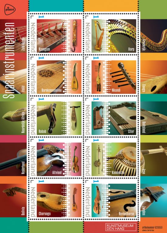 De Haas wilde een evenwichtige spreiding laten zien van westerse en niet-westerse instrumenten. ‘Ze zijn niet tegenover elkaar gezet, maar diagonaal links en rechts over het postzegelvel verdeeld. Het wezen van muziek is immers de verbinding. Op de postzegels staan snaarinstrumenten uit alle windstreken. Uit Europa natuurlijk, maar ook Afrika, Amerika en Azië komen aan bod. De vorm van de instrumenten loopt uiteen. De harp is een veelsnarig, complex en groot instrument. De rabab daarentegen is maar een klein instrumentje met een paar snaren. De klankkast van de afgebeelde kamancha is weer gemaakt van het rugpantser van een gordeldier. Diversiteit was belangrijk bij mijn keuze. Ook als het om de speelwijze gaat, tokkelen versus strijken. Vandaar dat je op sommige postzegels de bijbehorende strijkstok ziet.’