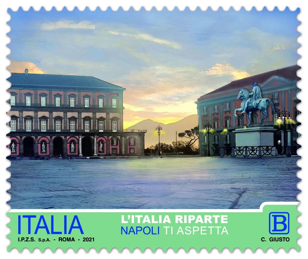 ‘Italië start weer, Napels wacht op je’ is de speciale postzegel die is verschenen van de Italiaanse Post in 2021. De postzegel gemaakt door Velia Cammarano , fotograaf van de burgemeester van Napels (Luigi de Magistris), altijd aanwezig met haar camera, klaar om de belangrijkste momenten in het leven van de Napoli en haar instellingen vast te leggen, is een echte lofzang op het herstarten van het toerisme.