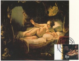 Met de pikant afgebeeld Danaë uit de Griekse mythologie geeft Rembrandt ons een beeld van een naakte vrouw op een prachtig bed in een onderbelichte slaapkamer. De opgerichte, de partner verwelkomende hand verwijst in dezelfde richting als waarheen ook de blik van Danaë en haar bewakende dienares gaan. De plaats van waar zij de naderende minnaar verwachten.