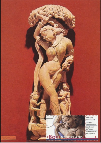 De tempels van Khajuraho (India) zijn rijkelijk voorzien van erotisch beeldhouwwerk. Deze hemelse schone (met een vliegenwaaier boven haar hoofd) fungeerde als bekroning van een zuil in de tempelhal. De vrouw / tempeldienares slaat een aapje weg, dat aan haar heupkleed trekt. Indrukken van de nagels van haar minnaar / heerser op haar slaap en in haar schouder verraden dat ze zojuist nog in gezelschap was (rituele gemeenschap).