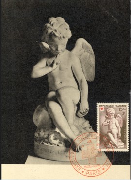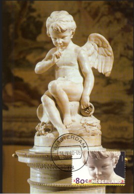 Het ondeugende cupido-figuurtje (Étienne Maurice Falconet, nvph 1902) met gespreide vleugels zit op een wolk, die op een ronde plint is geplaatst, staande op een zuil als voetstuk. Met het ‘ssst-gebaar’ met de wijsvinger voor de mond van zijn schalks glimlachende gezicht grijpt het wit marmerende amor-figuurtje met de andere hand naar een pijl uit de koker. Op voortreffelijk aansprekende wijze wordt een toespeling op de liefde in beeld gebracht, die door een bloeiende rozentak op de wolk nog versterkt wordt.