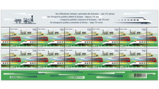 Toen op 9 augustus 1847 de eerste spoorlijn in Zwitserland tussen Zürich en Baden in gebruik werd genomen, markeerde dit het begin van een schitterende ontwikkeling voor ons land. De speciale postzegel uitgegeven ter gelegenheid van het 175-jarig jubileum onderstreept deze dynamiek in 2022.