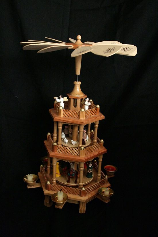 Kerstpiramiden worden over het algemeen gemaakt van hout met vier- tot achtzijdige platformen met een lange stang in het midden die dient om het geheel van draaiende plateaus te dragen. In een glazen of keramische drager bevindt zich een aandrijfas waaraan ten minste een platform is bevestigd. De figuren die staan op de platforms staan, worden traditioneel gemaakt van hout.