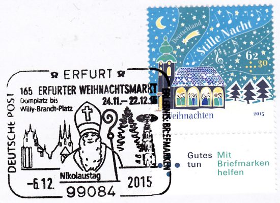 (Speciale postzegel uit Erfurt voor de 165e kerstmarkt van Erfurt op Sinterklaasdag 6 december 2015. De poststempel toont de kathedraal van Weimar, St. Nicolaas, een kerstboom en een kerstpiramide.)