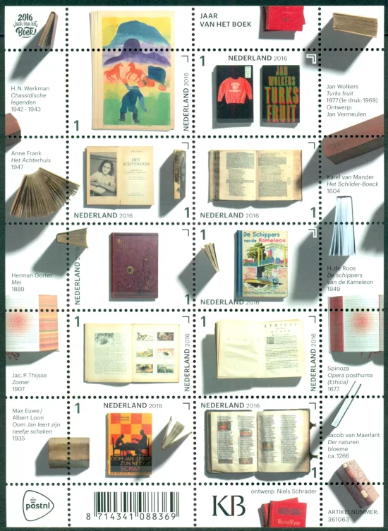 Het boekje kwam uit in 2016, het Jaar van het Boek. Toeval? PostNL bij monde van Leo Voorn: ‘Een groot aantal organisaties besteedt dit jaar extra aandacht aan lezen en schrijven. Zij organiseren daarvoor verrassende festivals, tentoonstellingen en boekverkiezingen. Met deze postzegeluitgifte levert PostNL ook een bijdrage. Daarbij geven wij aandacht aan de belangrijke rol die boeken spelen bij de culturele vorming van mensen. Op het postzegelvel staan tien bijzondere boeken uit de collectie van de Koninklijke Bibliotheek (KB).