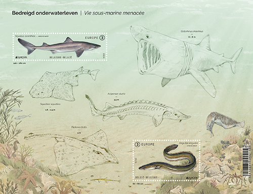 Om te beginnen de PostEurop-uitgave die dit jaar het gemeenschappelijke  thema “bedreigd onderwaterleven” heeft. In een velletje dat een beeld geeft van het leven onder water twee zegels in de waarde Europe 3  (oplage 35147) een doornhaai en een paling.