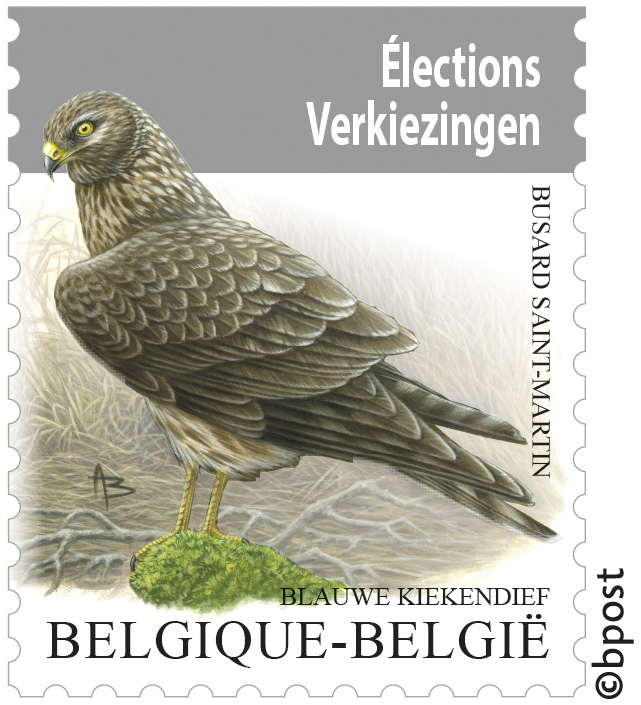 En dan de kiekendief. Vermoedelijk heeft men bij bpost nou niet bepaald raad geweten met het beeld. Daarom hebben ze een bekend ontwerper aan het werk gezet. De zegel (oplage onbeperkt) is namelijk ontworpen door de in de postzegelwereld  beroemde André Buzin, die onder andere naam heeft gemaakt met de sinds eind jaren “80 van de vorige eeuw ‘’ lopende vogelzegels. De zegel hoort thuis in  tenminste drie verzamelingen: uiteraard België, in het thema vogels, en, misschien een beetje te ver gezocht, in het thema Europa.