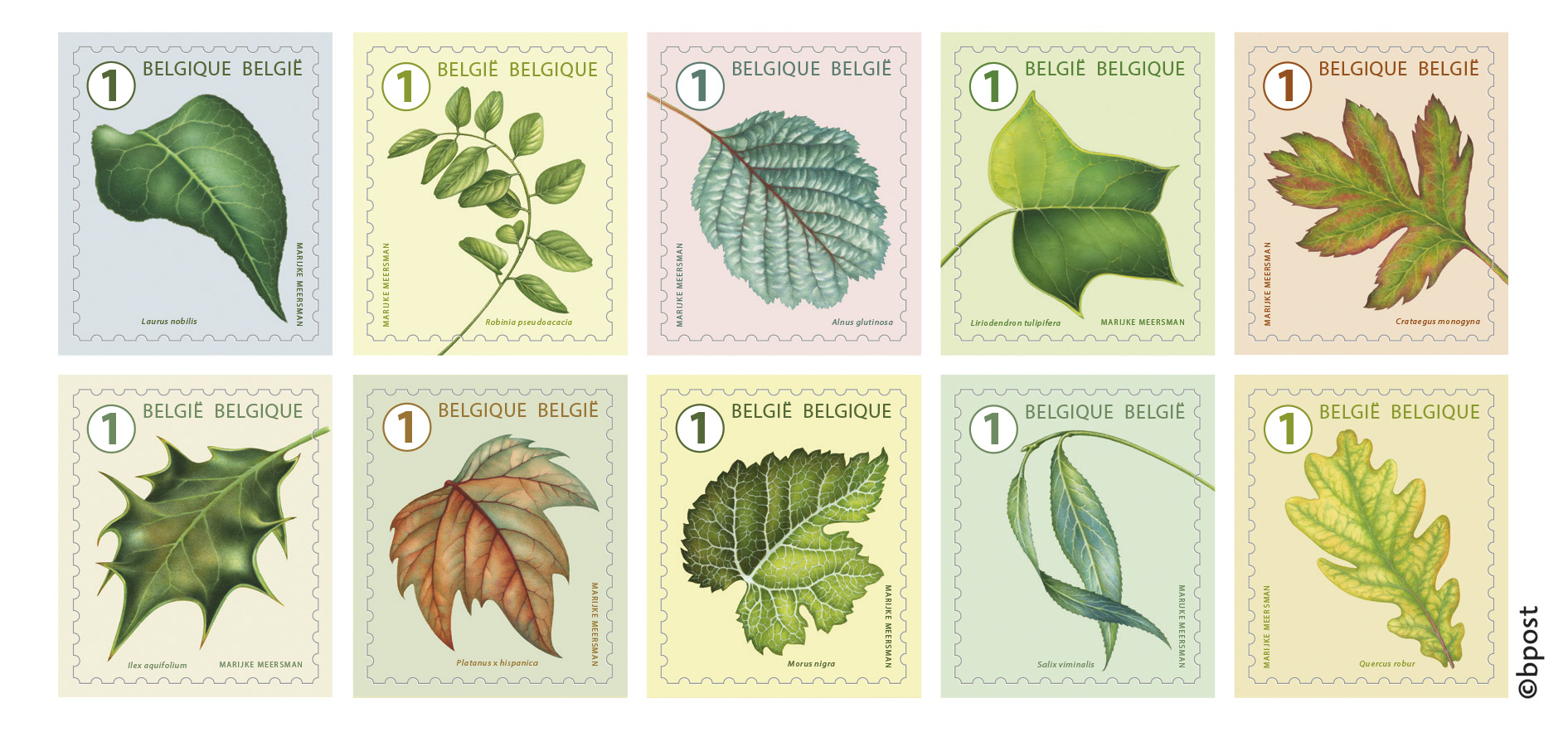 Tot besluit een boekje met tien zegels met als werktitel “Tien bladvormen anders bekeken”. Waarde-aanduiding 1; de oplage wordt naderhand bekendgemaakt. Bladvormen o.a. van de laurier, huls, gewone plataan zomereik.