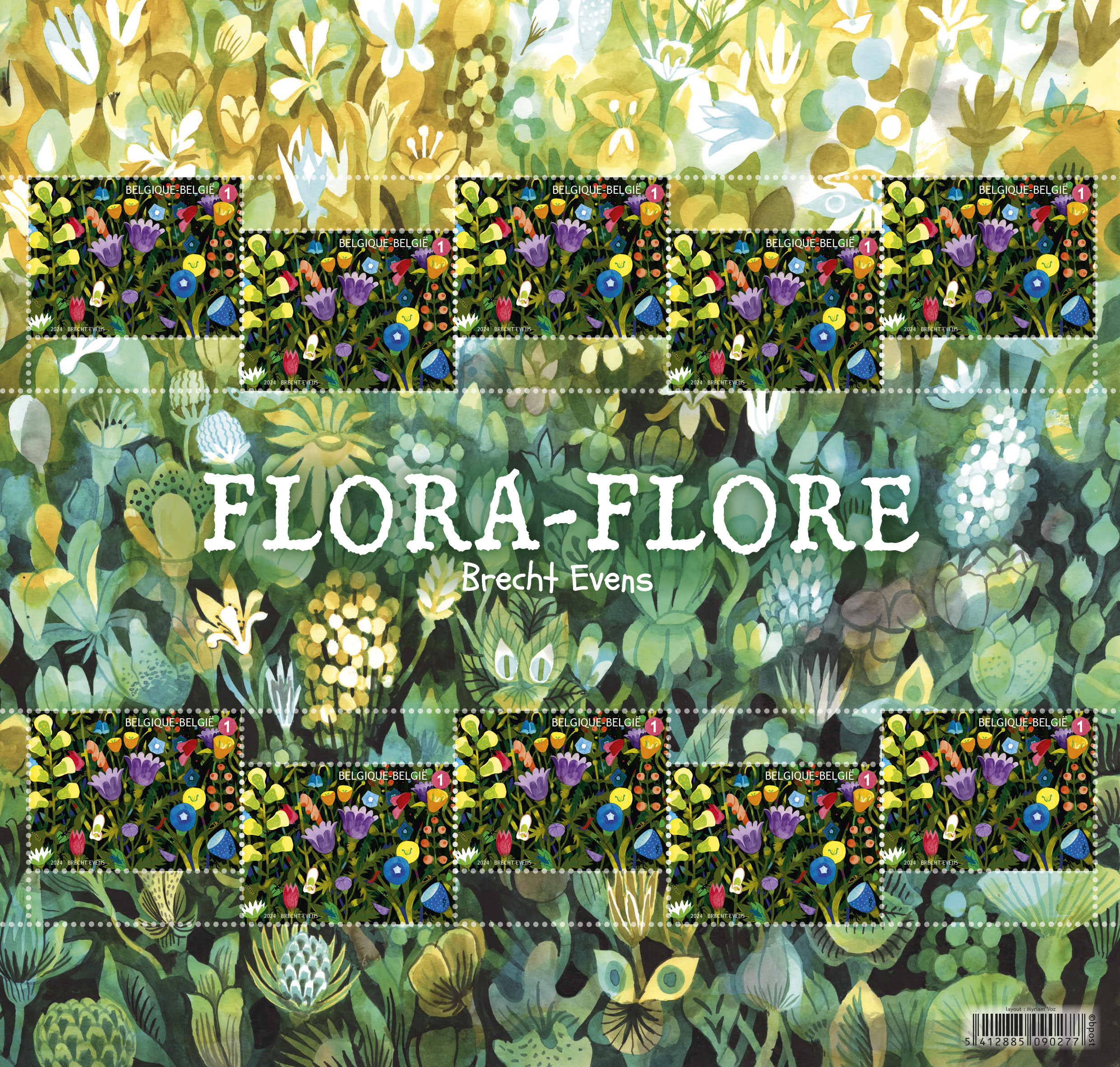 Het velletje getitelde Flora-Flore is een werk van de Belgische striptekenaar en illustrator Brecht Evens, die zijn grote doorbraak beleefde in 2009 met “Ergens waar je niet wilt zijn”, waarvoor hij de Willy Vandersteen-prijs ontving en genomineerd werd voor een Eisner een internationaal geroemde Amerikaanse stripprijs. Het velletje is een kleurrijk bloemenveld waarin tien identieke zegels met de waarde aanduiding 1; oplage 13.205.