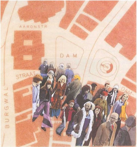 Een stoet voetgangers die het Muntplein oversteken, is geprojecteerd op de actuele Amsterdamse stadsplattegrond van de Dienst Publieke Werken rondom het Paleis op de Dam. Het ontwerpersduo Paul Mijksenaar en Jan van Toorn selecteerden uit 143 zwart-wit foto’s (naderhand ingekleurd, fotograaf Hilda Guntenaar) deze fotocollage van gaande en komende mensen op de Dam als centrum van de stad.