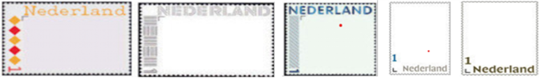 De L-vormige tekst-bedrukking wordt in de loop der jaren steeds meer geminimaliseerd niet alleen in de notatie en grootte van de landsnaam en frankeerwaarde (eurocent – frankeercijfer), maar ook in kleurigheid.