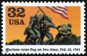 Om het Amerikaanse Korps Mariniers te eren op een postzegel, koos het Amerikaanse postkantoor een van de meest iconische afbeeldingen uit de Tweede Wereldoorlog. De postzegel toont het hijsen van de Amerikaanse vlag boven Mount Suribachi op het eiland Iwo Jima. Het ontwerp van de 3-centzegel, uitgegeven op 11 juli 1945, is een reproductie van de historische foto die Joe Rosenthal van Associated Press op 23 februari 1945 maakte. De gevechten op Iwo Jima zouden nog vier weken duren nadat Rosenthal zijn beroemde foto had gemaakt.