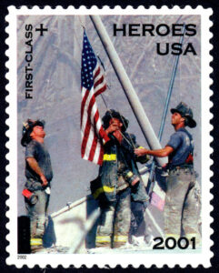 (De postzegel van 45 cent, waarop drie brandweerlieden staan ??afgebeeld op Ground Zero die een Amerikaanse vlag hijsen, was geldig voor het tarief van 34 cent voor de eerste klas-reis. De extra 11 cent ging naar een fonds om financiële hulp te bieden aan families van hulpverleners die zijn omgekomen of blijvend invalide zijn geraakt als gevolg van de aanslagen van 11 september.)