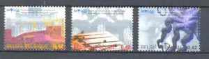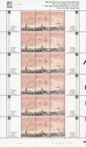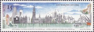 Doorlopend panorama van Brussel en zijn multicultureel karakter, samengesteld uit 3 postzegels en 2 vignetten: Bevolking, Kunst en cultuur, Communicatie. Ontwerper is François Schuiten.